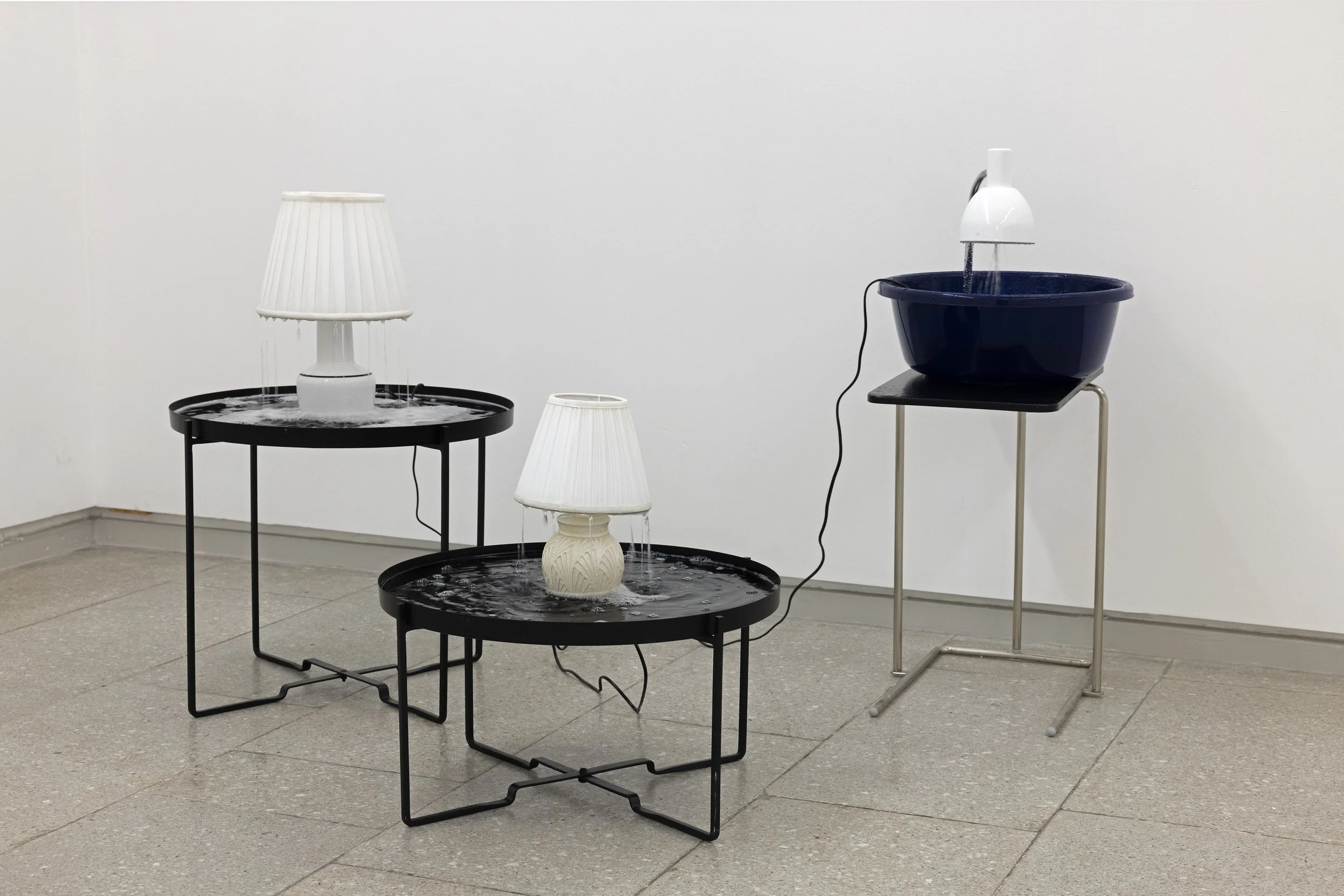 Three installations also center around water as a crucial element. Ordinary table lamps have been transformed into water-bearing objects, and the juxtaposition of domestic furnishings with running water signals decay and a situation out of control. At the same time, the sound of the ever-flowing water has a strong calming effect. Water is both a life-giving force, yet also uncontrollable. In this way, water can symbolize a range of ambiguous feelings, representing both vitality and concern, in both a private, inner and a shared, external context.