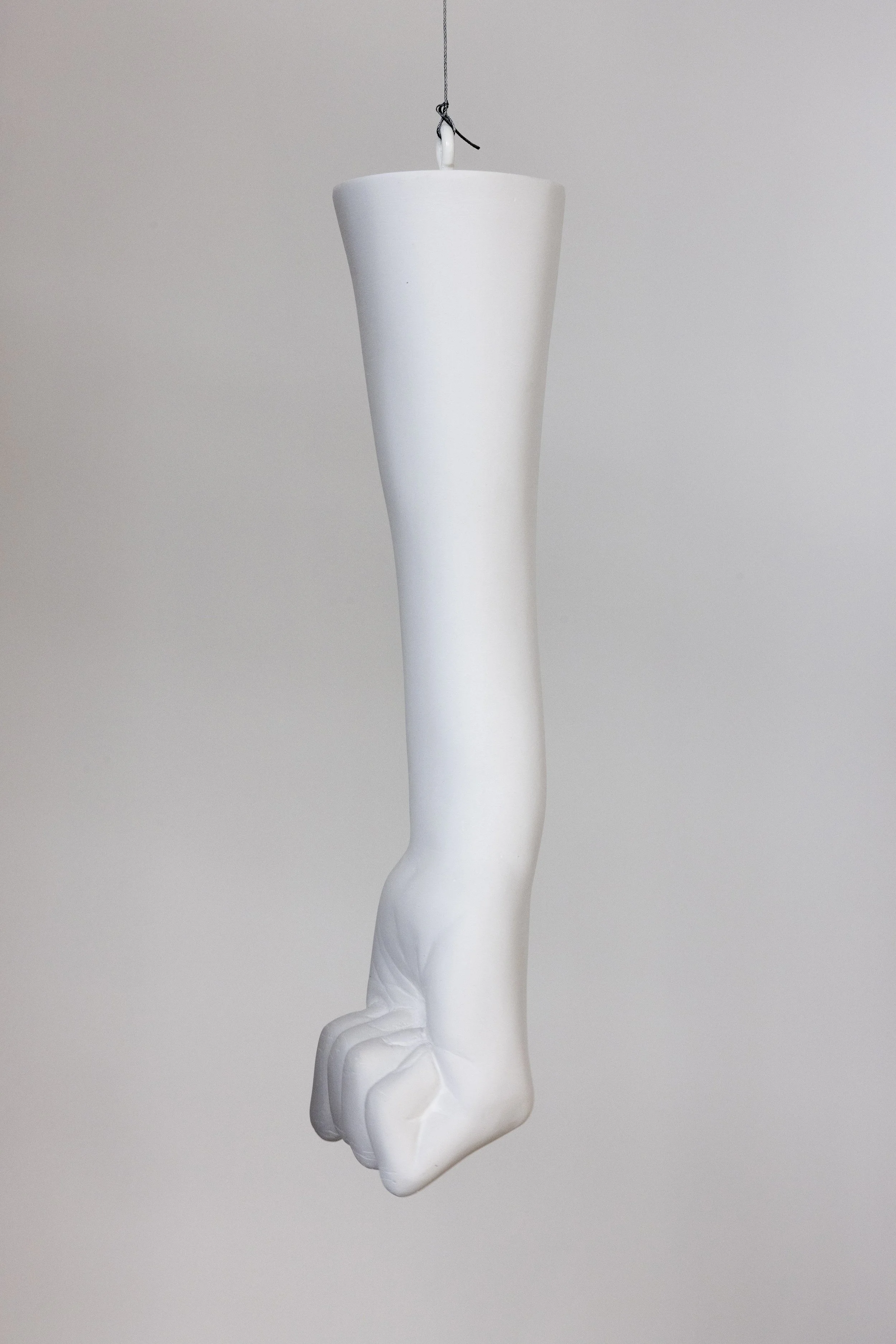 Two plaster works, which take as their starting point a vulnerable and challenged body, also maintain this sense of opposition. Feet standing on tiptoe in a moment of balance, and two detached forearms with clenched hands missing their thumbs, evoke uncertainty about direction and bodily orientation.