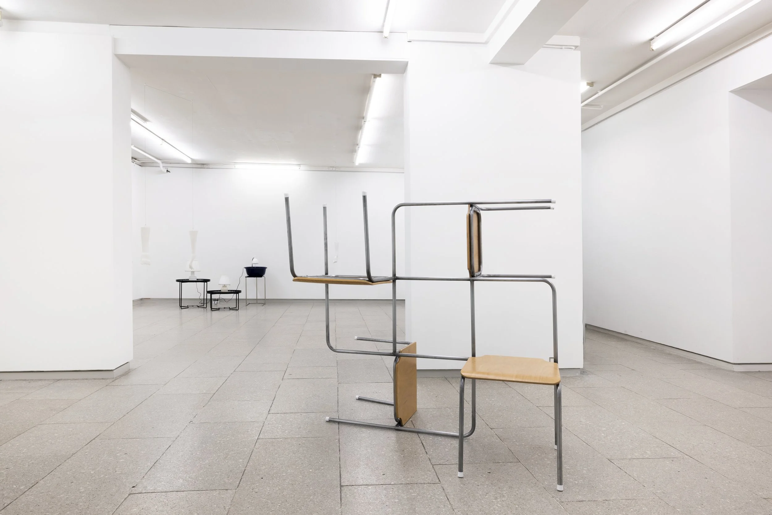 The largest sculpture in the exhibition is constructed from four identical chairs, arranged so that they can be approached from different angles, and thus have no true front or back. Only one of the chairs can be used at a time, thus the piece of furniture does not invite for staying together but becomes a construction for antisociality and loneliness.