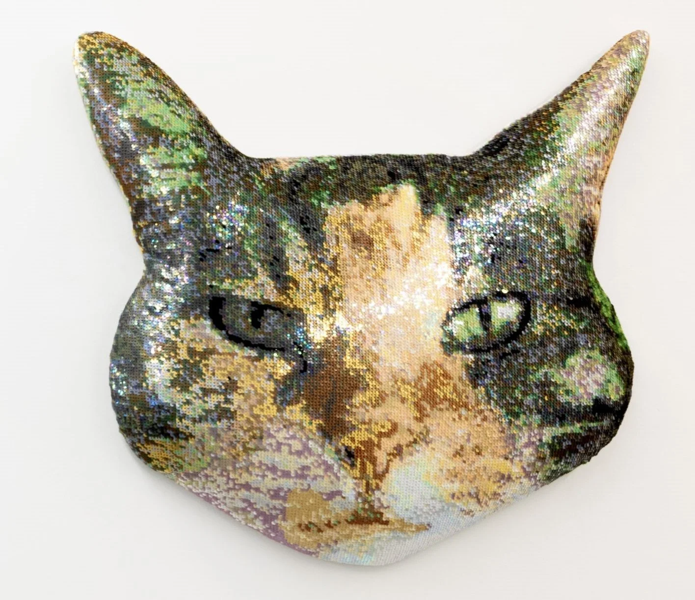 Hand stitched sequins on textile, foam, wood